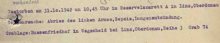 Фамилия Голод Имя Петр Отчество Тимофеевич Дата рождения/Возраст 03.09.1911 Место рождения Дмитровичи Дата пленения 22.06.1941 Лагерь шталаг X D (310) Лагерный номер 20882 Судьба Погиб в плену Воинское звание красноармеец|рядовой Дата смерти 31.10.1942 Первичное место захоронения Вегшайд/Линц Могила ряд 3, могила 74 Название источника донесения ЦАМО Номер фонда источника информации 58 Номер описи источника информации 977520 Номер дела источника информации 2456 https://obd-memorial.ru/html/info.htm?id=300348665