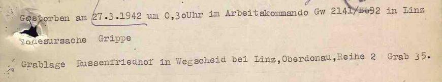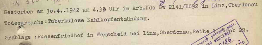 Фамилия Остапенко Имя Иван Отчество Федорович Дата рождения/Возраст 18.08.1941 Место рождения Молошковичи Дата пленения __.07.1941 Лагерь шталаг X D (310) Лагерный номер 24773 Судьба Погиб в плену Воинское звание красноармеец|рядовой Дата смерти 31.03.1942 Первичное место захоронения Вегшайд/Линц Могила ряд 2, могила 40 Название источника донесения ЦАМО https://obd-memorial.ru/html/info.htm?id=300379580