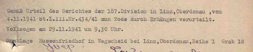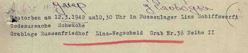 Фамилия Максимов Имя Степан Отчество Федосеевич Дата рождения/Возраст __.__.1918 Место рождения Богушовка Дата пленения 04.07.1941 Место пленения Пружаны Лагерь шталаг X D (310) Лагерный номер 24259 Судьба Погиб в плену Воинское звание красноармеец|рядовой Дата смерти 27.03.1942 Первичное место захоронения Вегшайд/Линц Могила ряд 2, могила 35 Название источника донесения ЦАМО https://obd-memorial.ru/html/info.htm?id=300336288
