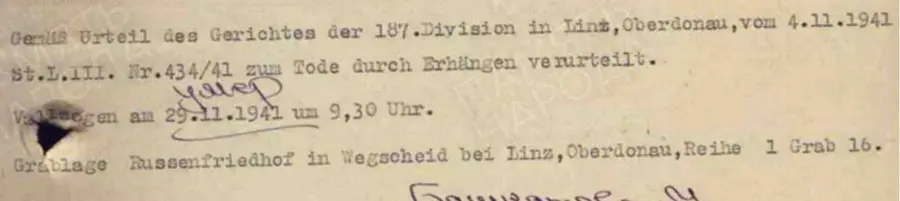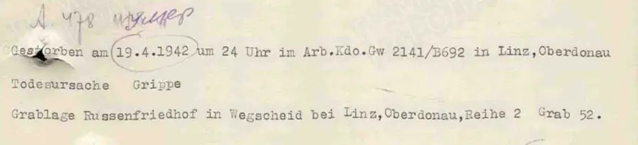 Фамилия Куриленок Имя Филипп Отчество Иванович Дата рождения/Возраст 10.11.1913 Место рождения Бояры Дата пленения 28.06.1941 Место пленения Лида Лагерь шталаг X D (310) Лагерный номер 22820 Судьба Погиб в плену Воинское звание красноармеец|рядовой Дата смерти 31.03.1942 Первичное место захоронения Вегшайд/Линц Могила ряд 2, могила 39 Название источника донесения ЦАМО https://obd-memorial.ru/html/info.htm?id=300376690