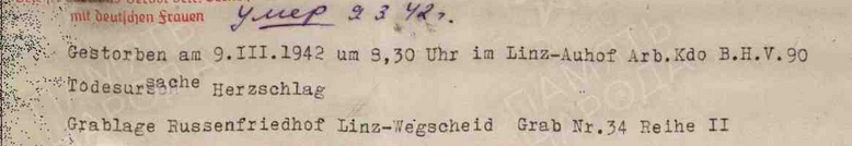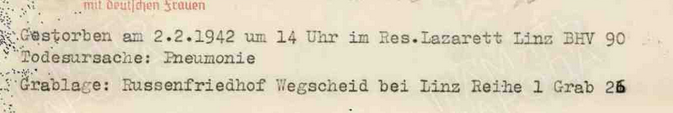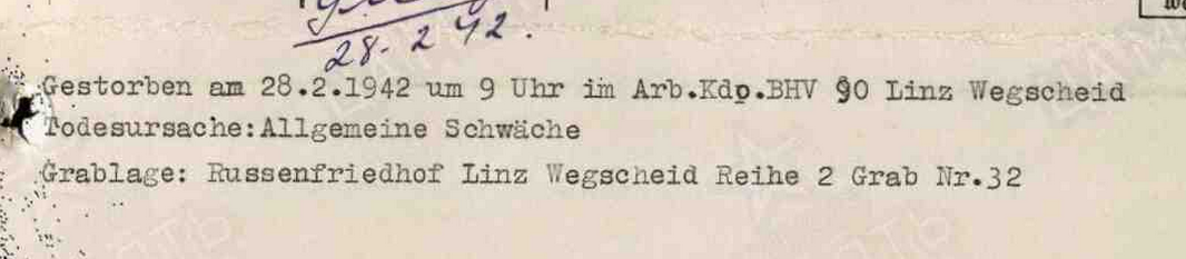 Фамилия Малахов Имя Николай Отчество Петрович Дата рождения/Возраст __.__.1899 Место рождения Ивановские Выселки Дата пленения 26.09.1941 Место пленения Погар Лагерь шталаг XVII B Лагерный номер 76817 Судьба Погиб в плену Воинское звание красноармеец|рядовой Дата смерти 14.02.1942 Первичное место захоронения Вегшайд/Линц Могила ряд 1, могила 28 Название источника донесения ЦАМО https://obd-memorial.ru/html/info.htm?id=300636898 Qui quaerit, reperit
