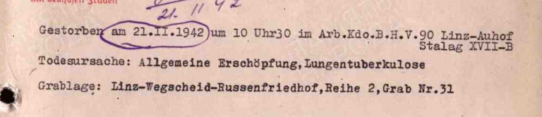 Фамилия Терехов Имя Дмитрий Отчество Павлович Дата рождения/Возраст 10.10.1905 Место рождения Орловская обл. Дата пленения 12.10.1941 Место пленения Жуковка Лагерь шталаг XVII B Лагерный номер 77512 Судьба Погиб в плену Воинское звание красноармеец|рядовой Дата смерти 21.11.1942 Первичное место захоронения Вегшайд/Линц Могила ряд 2, могила 31 Название источника донесения ЦАМО https://obd-memorial.ru/html/info.htm?id=300446268