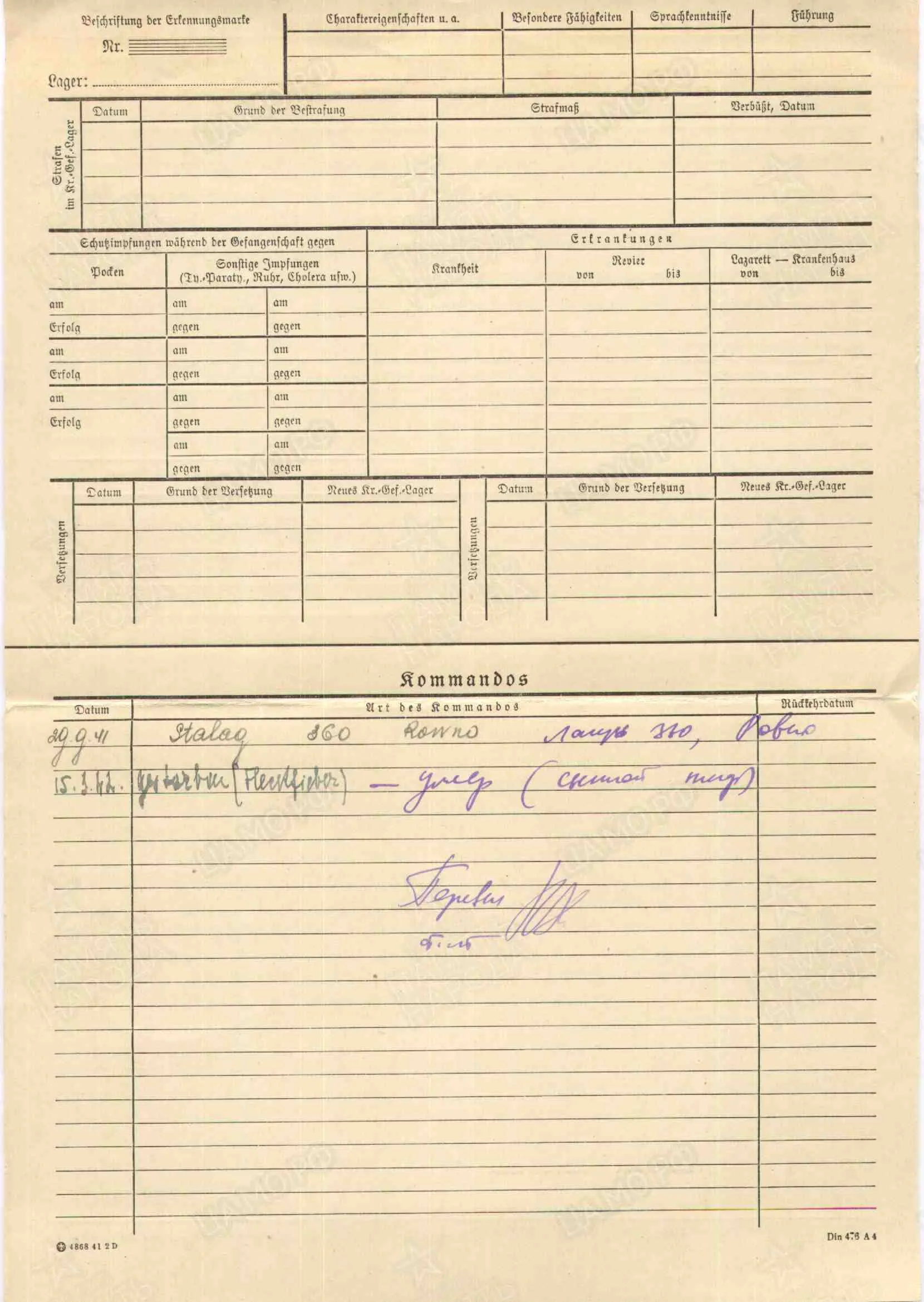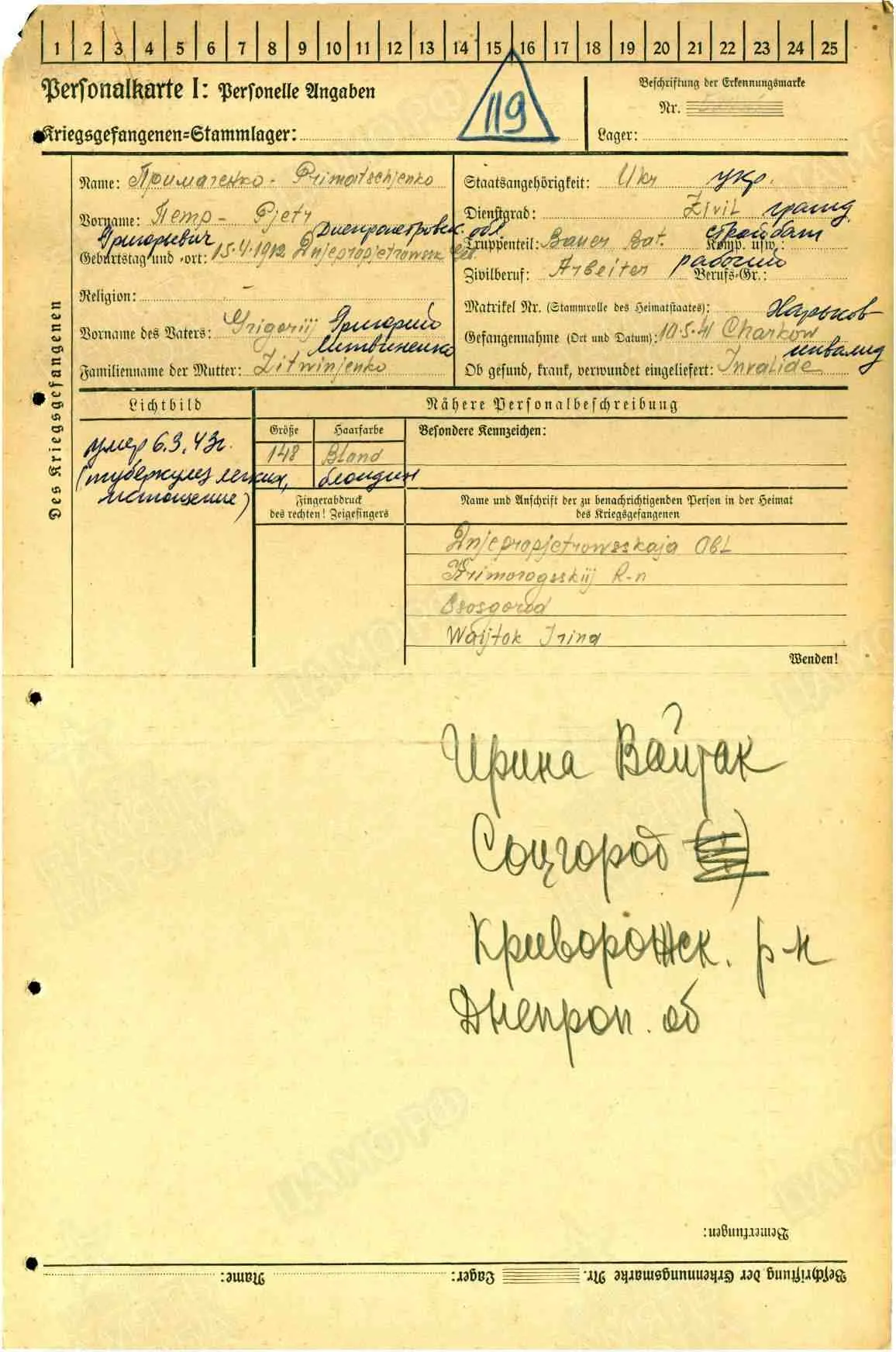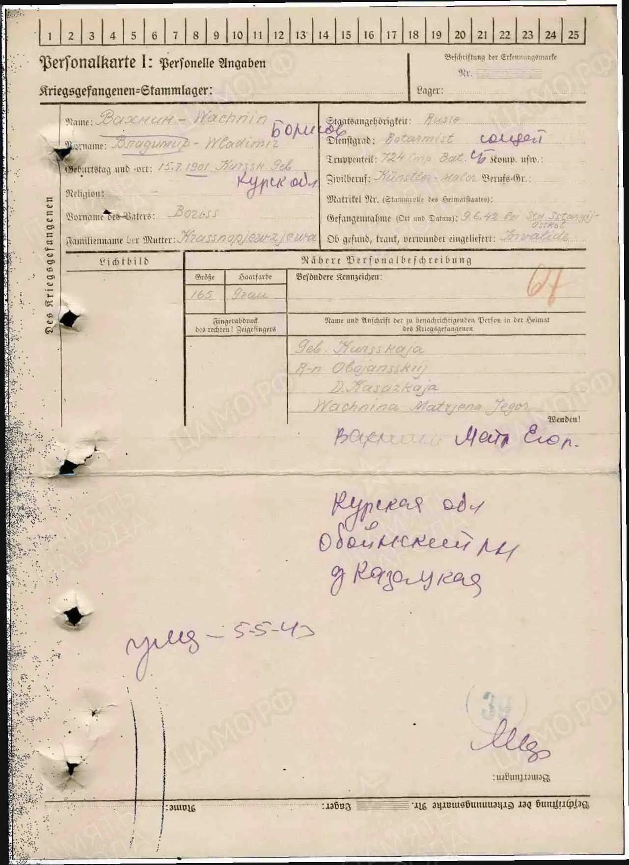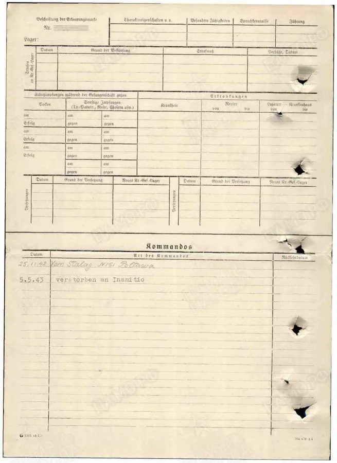 |  Вот карточка которую присылал Харитонов http://i052.radikal.ru/1106/eb/bc4776ac3a51.jpg И там есть отметка о нахождении в Шталаге 365, а также о попытке побега (отмечено темным квадратиком в поле с правой стороны). Но дальнейшие мои поиски не увенчались успехом. Я писал во множество архивов в надежде найти хоть какие-то сведения, но от всюду приходил ответ, что данных нет. Но если стоит отметка о нахождении в Шталаге 365, а также о неудавшемся побеге, значит где-то имеются более полные сведения? Может выписки из лагеря, заключения о смерти, какой-то отчет о попытке побега, фотографии лагеря, место братской могилы и т.д. Я не знаю как продолжать поиск, куда обращаться. Я так полагаю, что если на каждого заключенного заводилась карточка - это говорит о строгом учете всех заключенных, видимо после их смерти или массового захоронения должен был вестись какой-то учет. На мой вопрос откуда взялись данные о переводе в Шталаг 365 и предположительном месте захоронения, из Саксонского архива мне ответили, что все данные находятся в ЦАМО. На мой запрос туда получен ответ с копией анкеты, которую нашли и Вы. О лагере во Владимире Волынском не слова. Если Вы можете мне помочь и направить в нужном направлении мой поиск буду Вам благодарен.