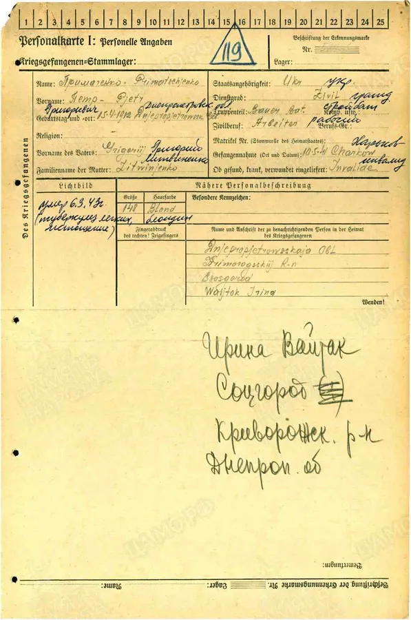 Карточка военнопленного захороненного во Владимире Волынском по версии операторов обд: