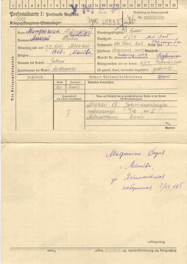 | Номер записи 272079619 Фамилия Митрюшин Имя Алексей Отчество Яковлевич Дата рождения 17.03.1908 Место рождения Московская обл., г. Москва Последнее место службы 220 сап. бат. Воинское звание мл. лейтенант Дата пленения 13.08.1941 Место пленения Подвысокое Судьба погиб в плену Дата смерти 15.03.1942 Название источника информации ЦАМО Номер фонда источника информации Картотека военнопленных офицеров https://obd-memorial.ru/html/info.htm?id=272079619