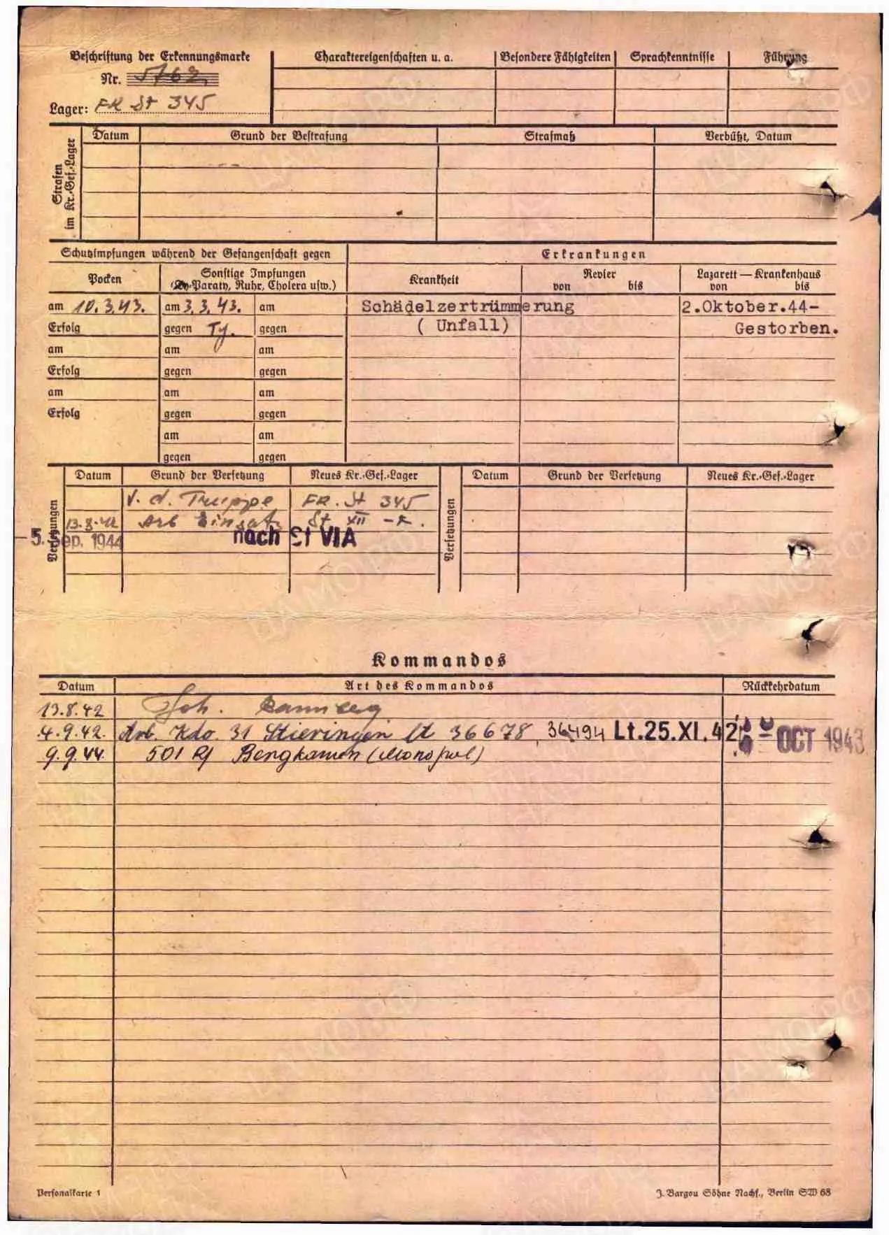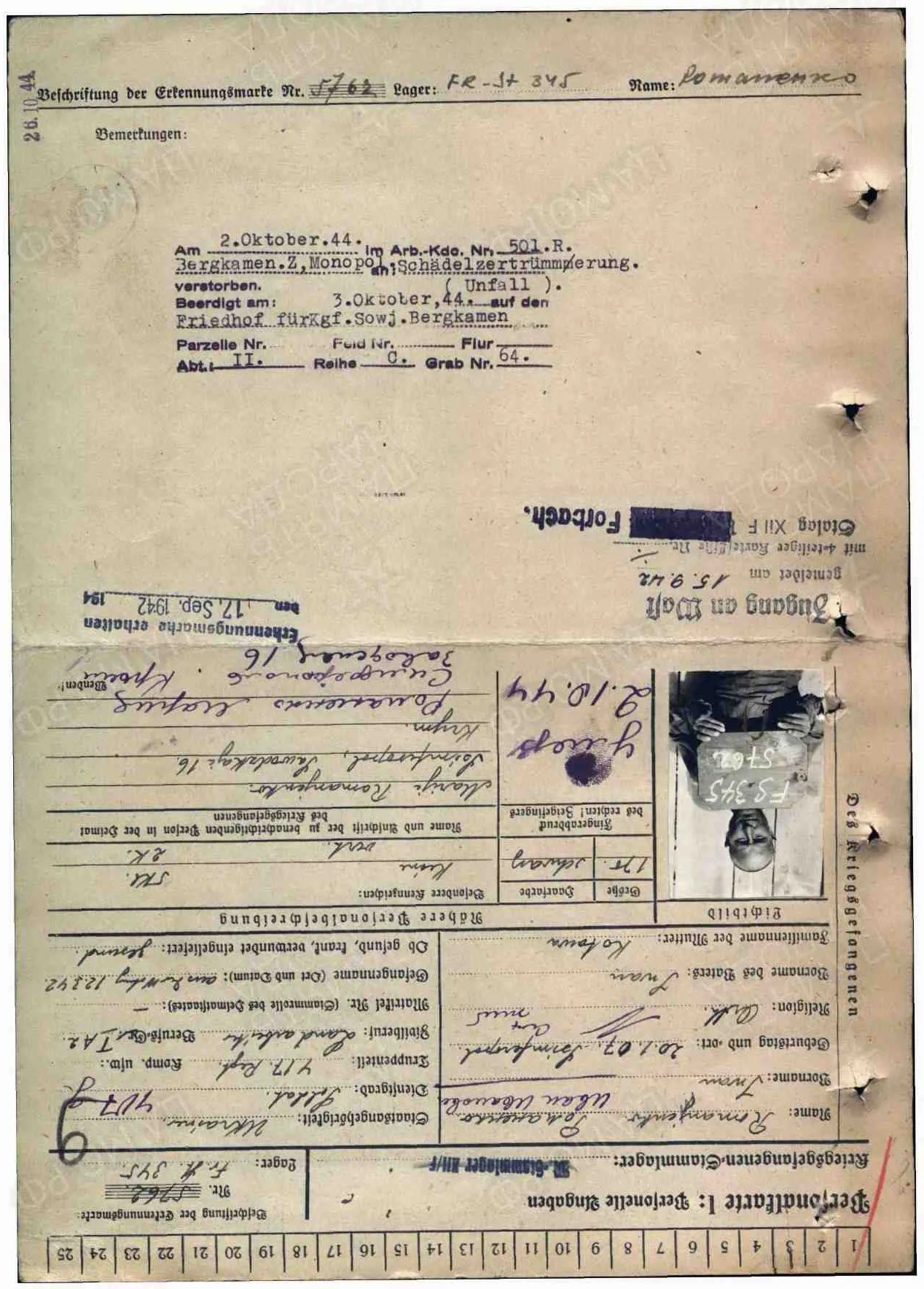 Информация о военнопленном ID 300039112 Фамилия Романенко Имя Иван Отчество Иванович Дата рождения/Возраст 20.01.1907 Место рождения Симферополь Дата пленения 12.03.1942 Лагерь шталаг 345 Лагерный номер 5762 Судьба Погиб в плену Воинское звание красноармеец|рядовой Дата смерти 02.10.1944 Первичное место захоронения Хемер (русское кладбище) Могила участок II, ряд C, могила 64 Название источника донесения ЦАМО Номер фонда источника информации 58 https://obd-memorial.ru/html/info.htm?id=300039112&p=1 Arb.Kdo.501 R Bergkamen. Z, Monopol Arbeitskommando 501 R Z - Zeche (шахта)