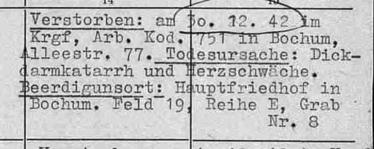 Заметно, что почти у всех погибших 14.05.1943 года нет даты рождения. Это всё жертвы бомбардировки союзников с 13 на 14 мая. В этот день в Бохуме погибло около 4000 человек.