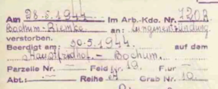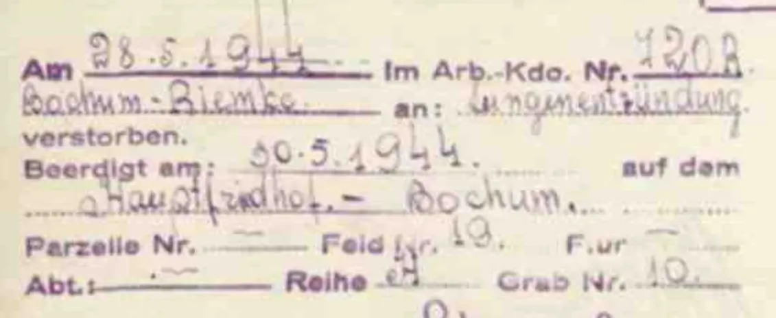 Пленный похоронен на центральном кладбище в Бохум. Возможно вскрытие произведено в морге центрального кладбища и выдана справка,