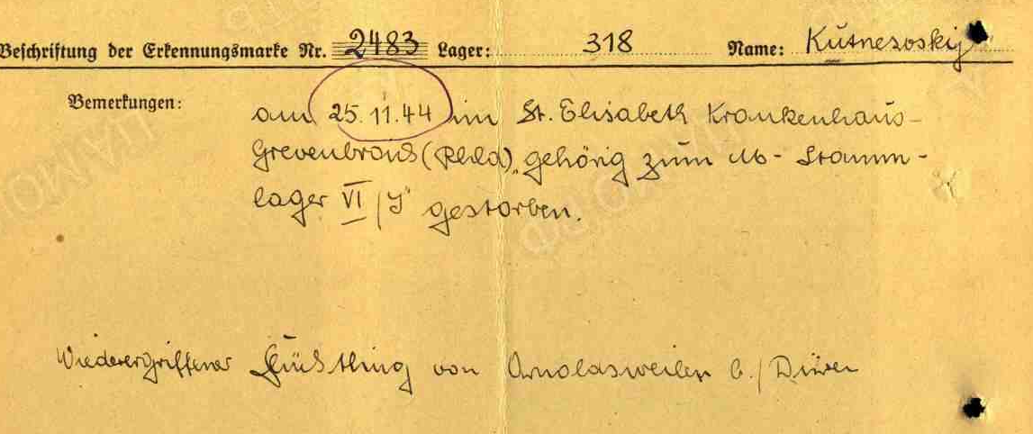 Фамилия Кутневский Имя Николай Дата рождения/Возраст 12.02.1921 Место рождения Сумы Лагерь шталаг VIII F (318) Лагерный номер 2438 Судьба Погиб в плену Воинское звание красноармеец|рядовой Дата смерти 25.11.1944 Первичное место захоронения Гревенбрюкк (место захоронения русских) Название источника донесения ЦАМО Номер фонда источника информации 58 Номер описи источника информации 977527 Номер дела источника информации 67 https://obd-memorial.ru/html/info.htm?id=301058093