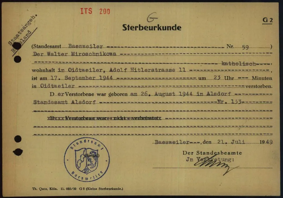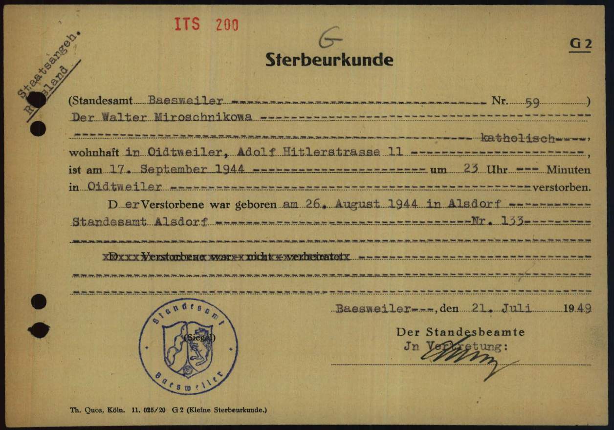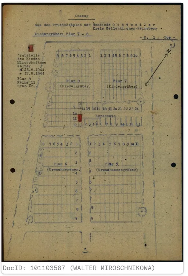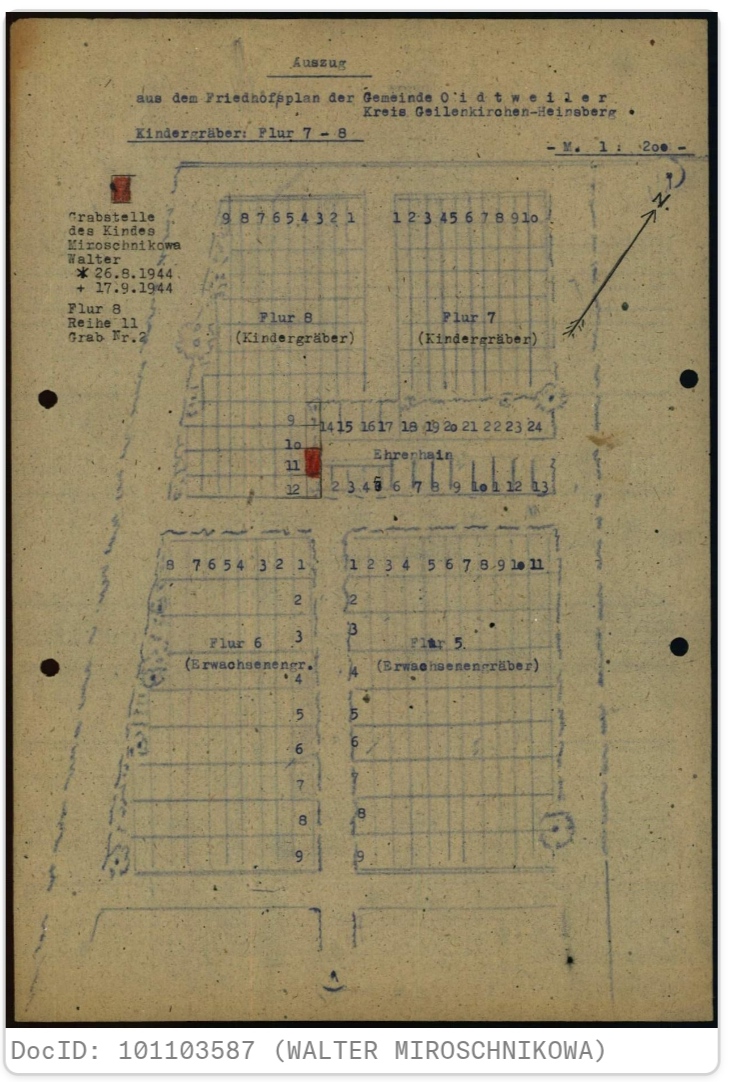 Ребëнок (младенец), видимо, мальчик Вальтер; тело предоставлено матерью по фамилии Мирошникова (наверное, остарбайтер), погребён на детском участке
