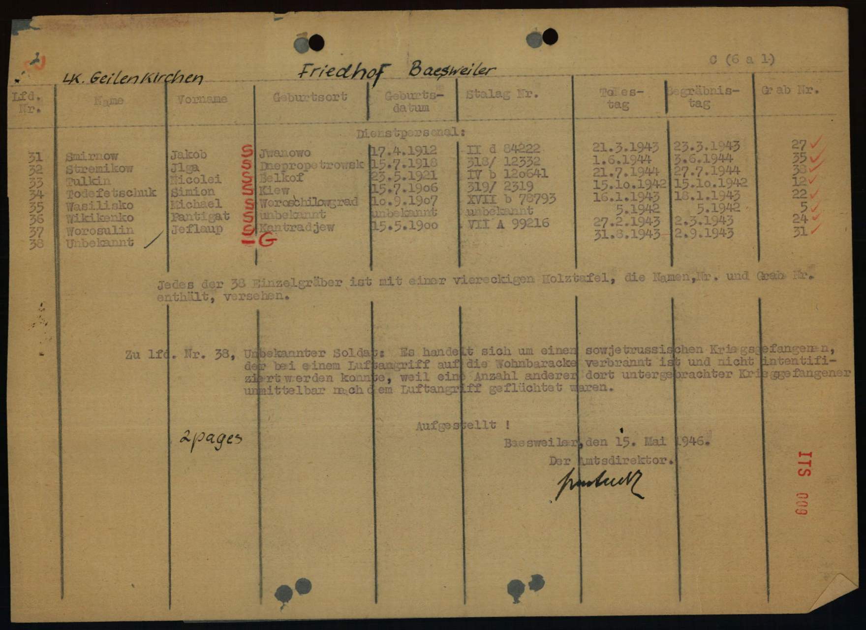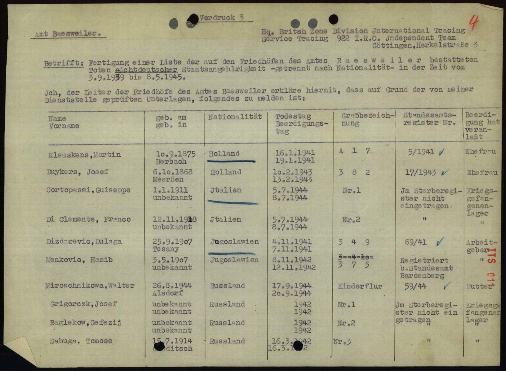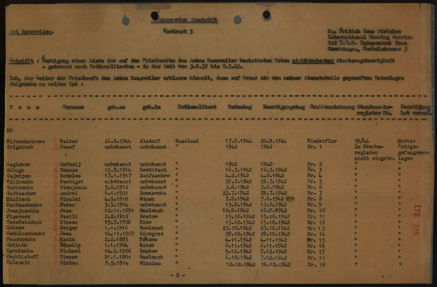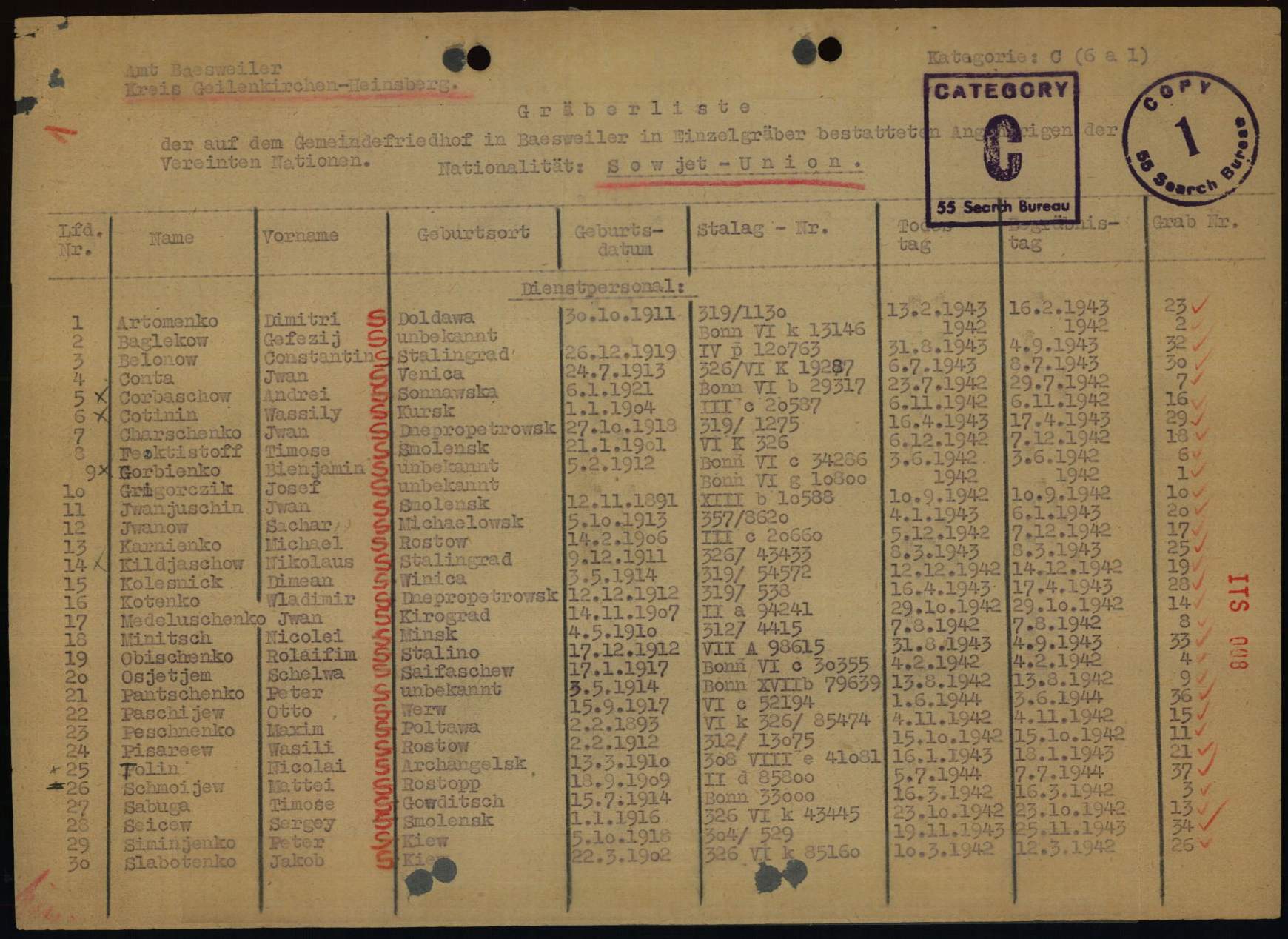 Списки первоначального захоронения на кладбище в Бесвайлере.