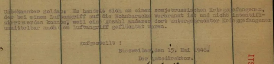 Неизвестный солдат: Это советский российский военнопленный, который сгорел заживо во время воздушного налета на жилые бараки, и его не удалось опознать, поскольку несколько других военнопленных, находившихся там, бежали сразу после воздушного налета.