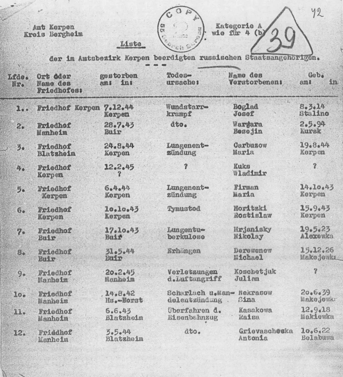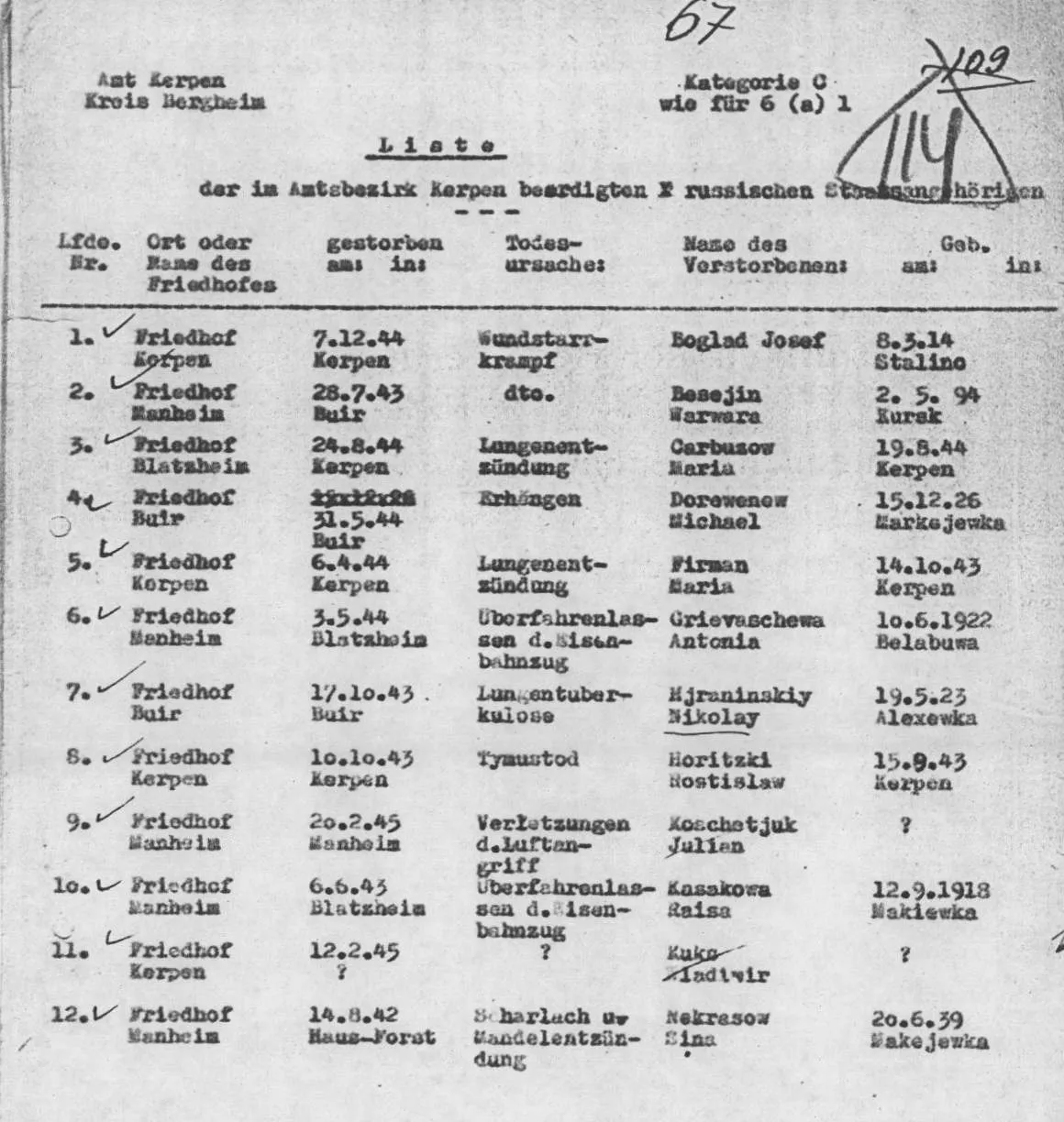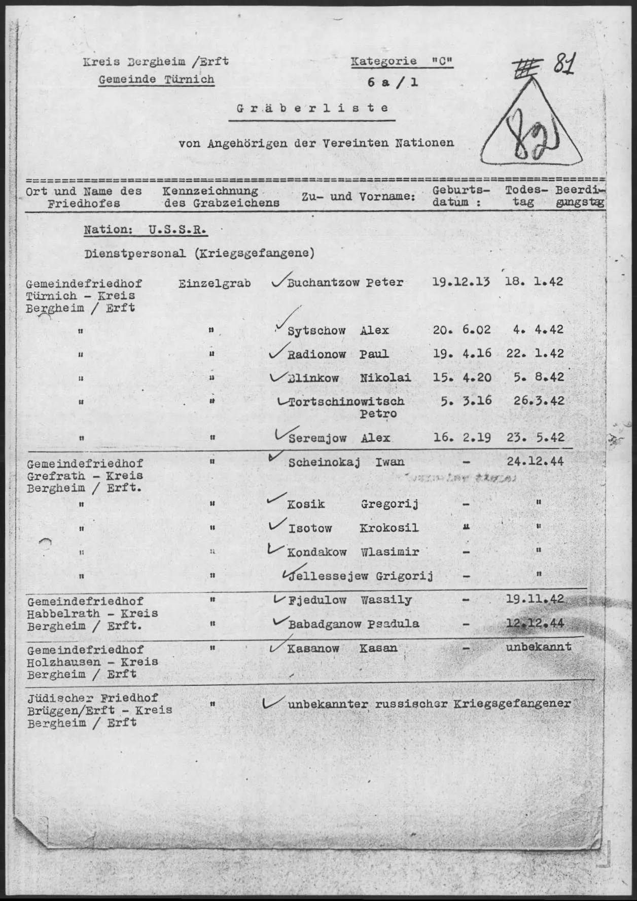 Список наших военнопленных, попавших на общинное кладбище Тюрних (Gemeindefriedhof Türnich), а также на другие общинные кладбища этого округа (см. подвешенный файл)