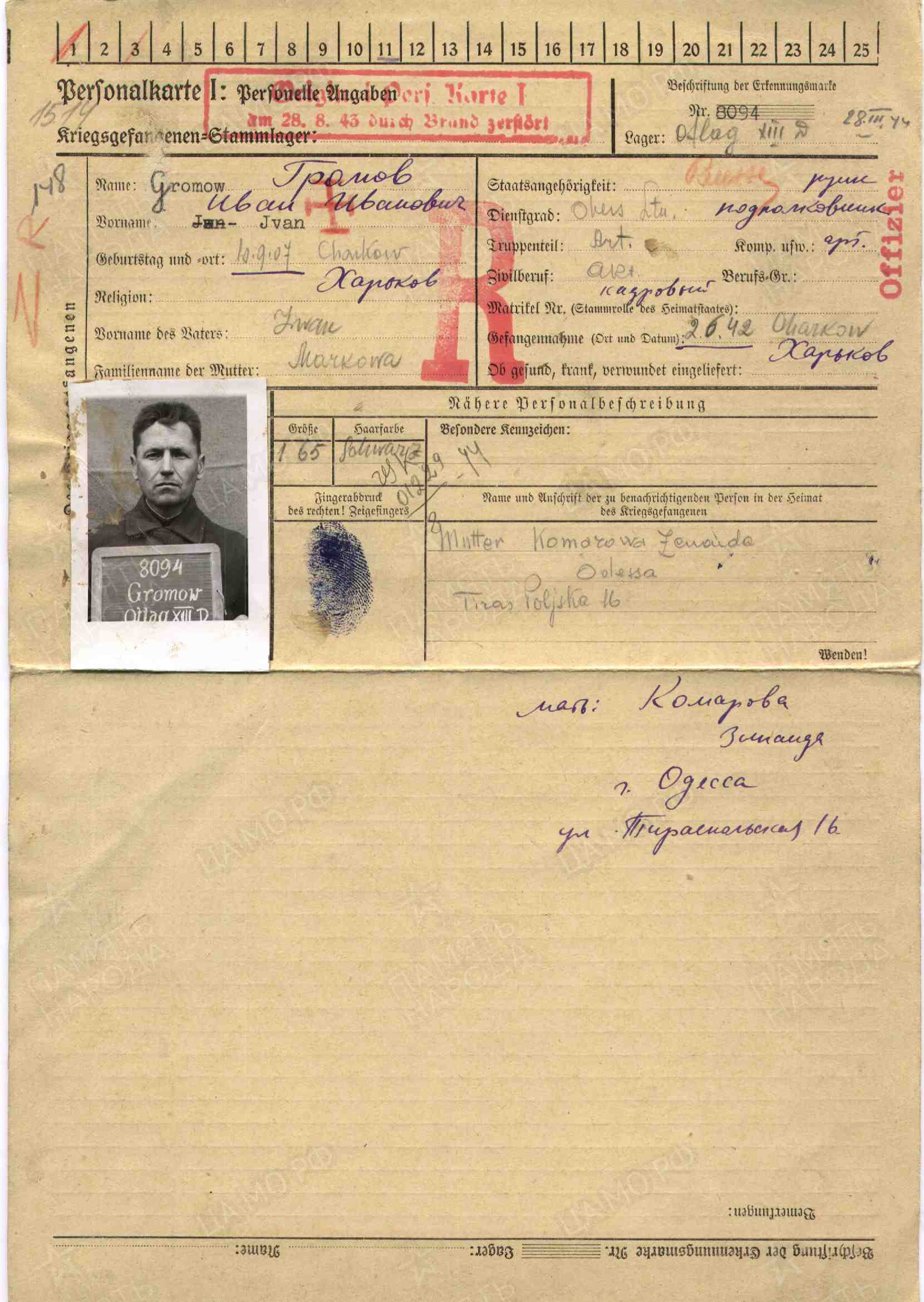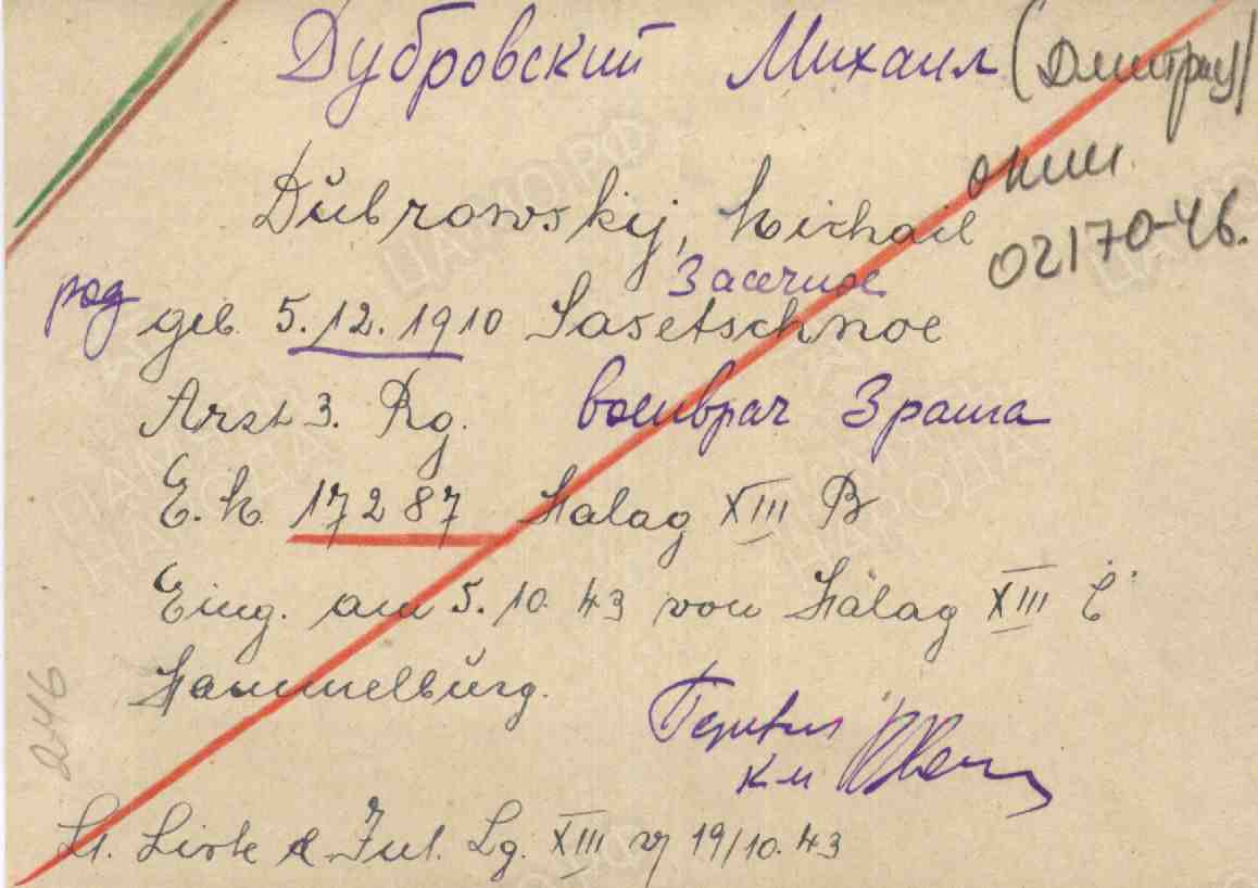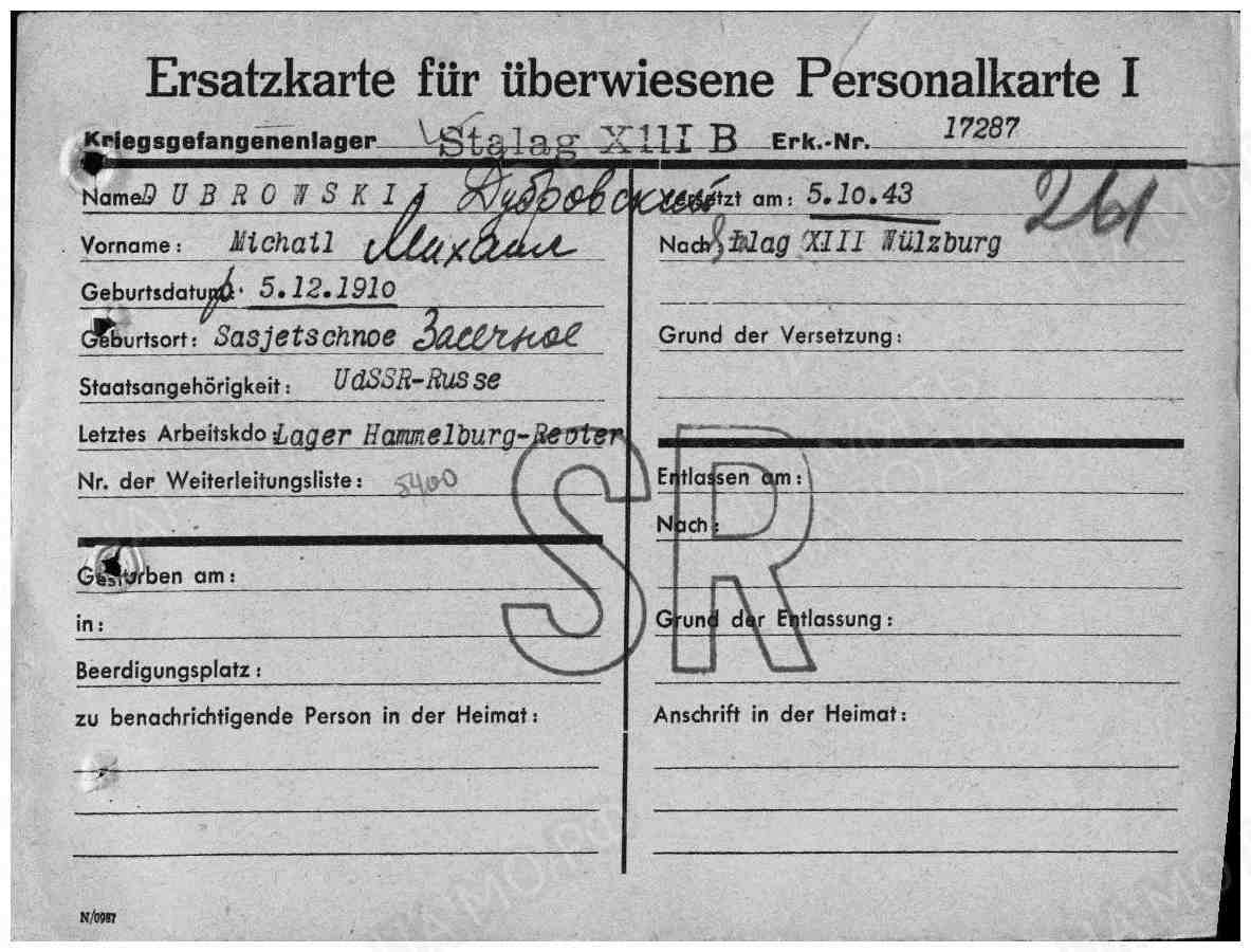 Фамилия Дубровский Имя Михаил Дата рождения/Возраст 05.12.1910 Место рождения Засечное Лагерь шталаг XIII B Лагерный номер 17287 Судьба попал в плен Воинское звание военврач