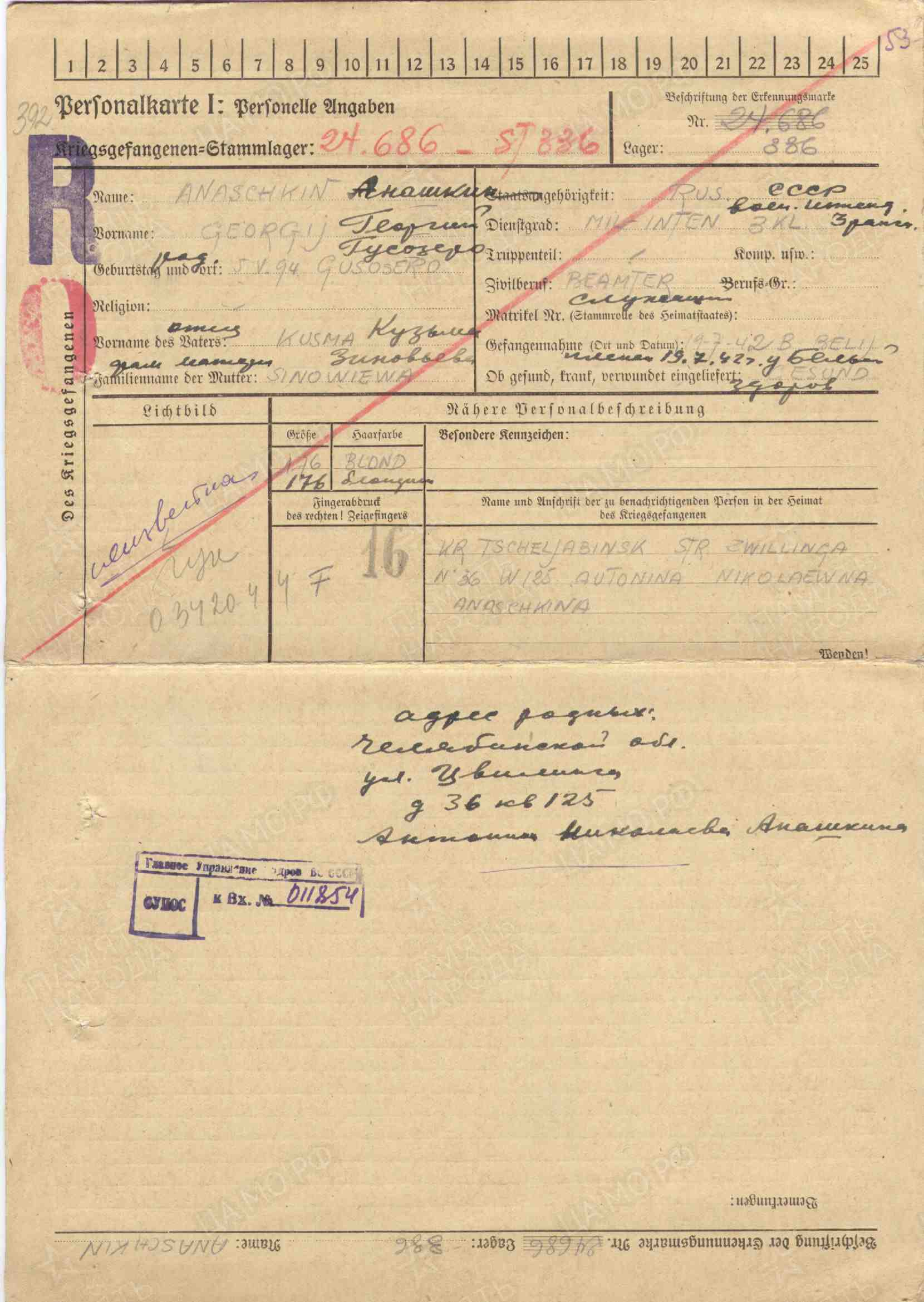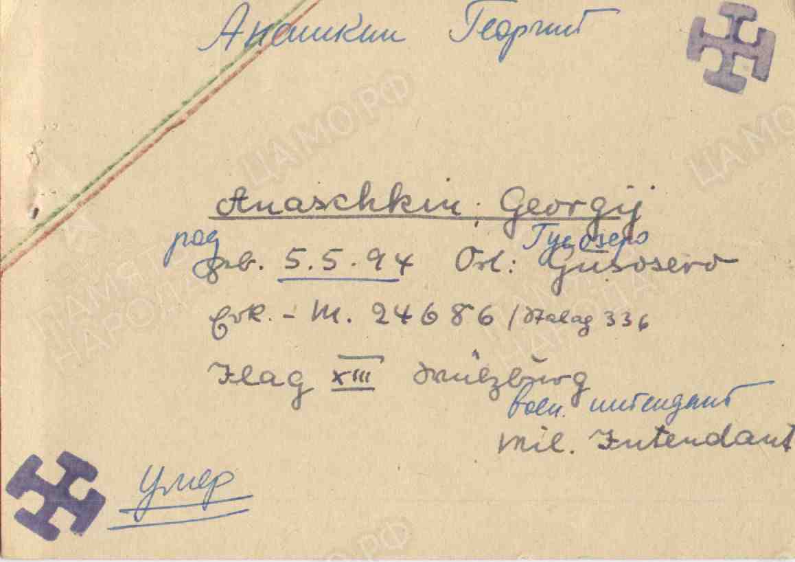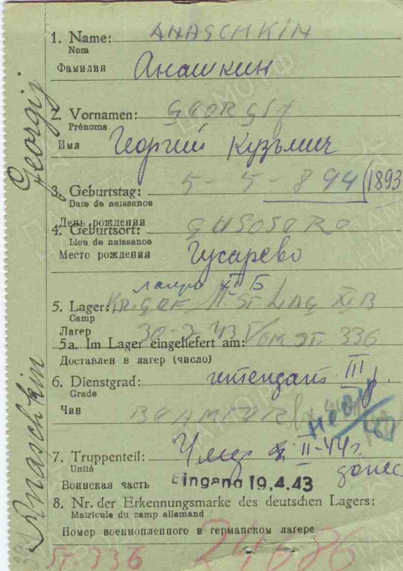 Фамилия Дубровский Имя Михаил Дата рождения/Возраст 05.12.1910 Место рождения Засечное Лагерь шталаг XIII B Лагерный номер 17287 Судьба попал в плен Воинское звание военврач