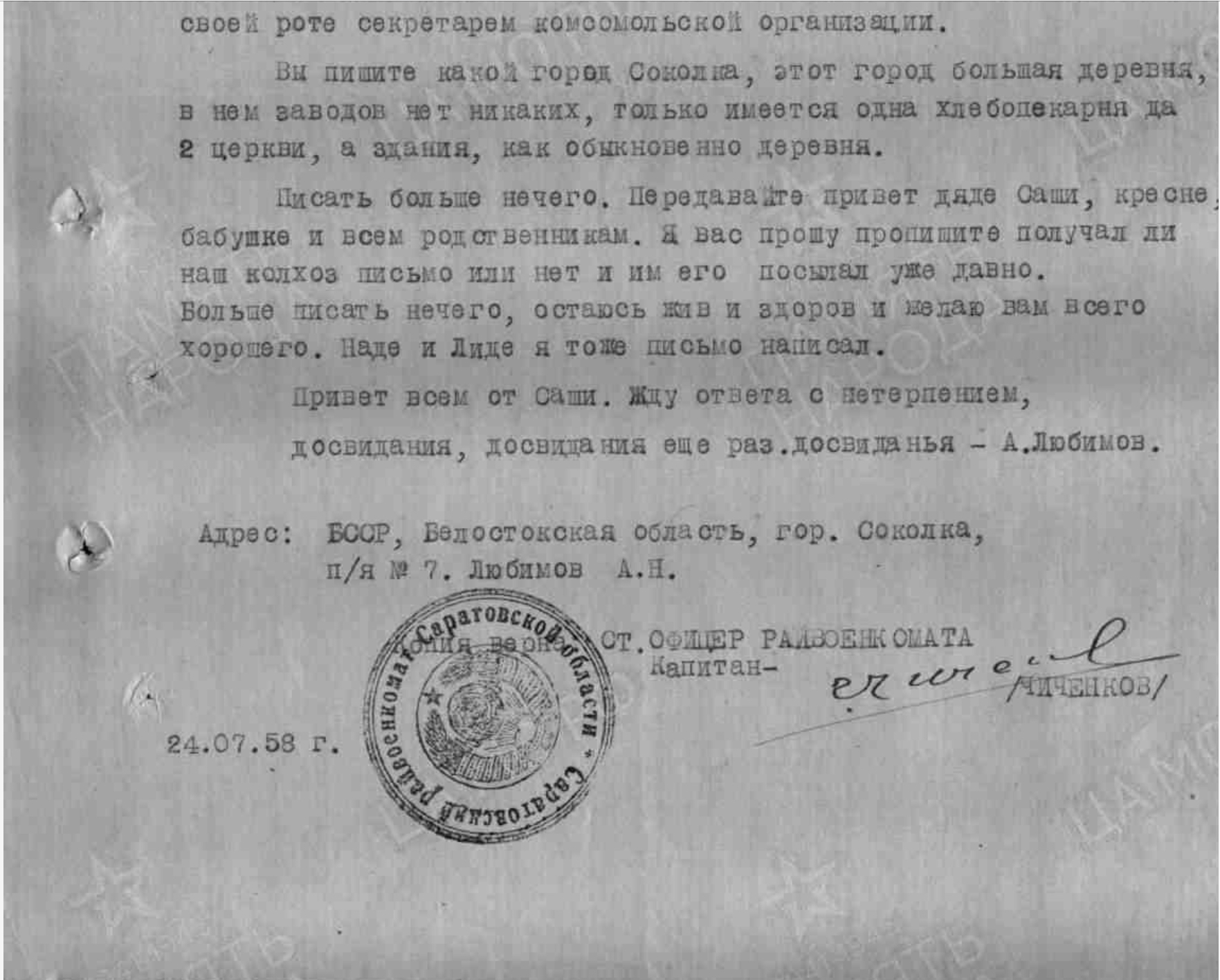 Письмо Любимова из ОБД от 1 июня 1941 с полным адресом видели?