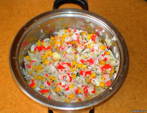 Быстро и очень быстро готовим салат из крабовых палочек с рисом и кукурузой консервированной! Исходные продукты мельчим и смешиваем с майонезом,не забывая посолить и поперчить по вкусу!