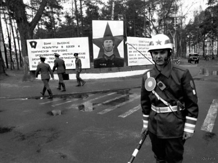Эти снимки 91 или 92 гг., так как 28 съезд был в 91м. В мои годы службы тумба была здоровая, а эта, наверно, временная. Регулировщик ушёл - и забрал её с собой. Андрей Голубев, 54 огбс, взвод регламента, 86-88 гг.