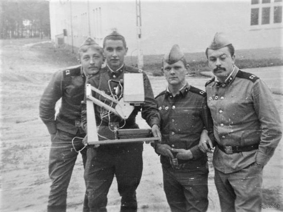 Снимок сделан за плацем 54огбс, судя по "персонажам", весной 1987 года. Слева направо: Саня Асеев, водитель самосвального Зил-130 "мусорки". Зимой 1987 -88 гг., закончив школу прапорщиков, он вернётся в родной хозвзвод. С фотоувеличителем "Ленинград-4" стоит Евтушок (имя не помню), вскоре он станет водителем комбатовского уазика. Саюлюс Матулайтис (погоняло Немец) из второй роты, насколько я помню, в разное время был каптёрщиком и хлеборезом. Евгений Мамедов - писарь хозчасти. На момент съёмки эта четвёрка отслужила соответственно 2 - О.5 - 1 - 2 года. Обратите внимание на небольшую пристройку в центре тыльной стороны штаба - это кабельный колодец связи, сбоку видна небольшая дверца. Сам колодец был неглубоким, около метра. Кабельные колодки, составляющие кросс (контрольно-распределительное устройство связи), крепились непосредственно на стене здания. В принципе, объёма колодца вполне хватало для моего комфортного размещения. В него заходили кабели, идущие из: дивизионного узла связи "Купорос", подвала казармы 1 мсб (хоменковского) 252 гв. мсп, парка огбс, казармы огбс и непосредственно из дежурки, располагавшейся в штабе батальона. Кроме того, из колодца выходило несколько "полевиков", в частности: телефон и ГГС КПП, тлф. "Нач. столовой", тлф. "Аккумуляторная". Сам колодец располагался между правым окном склада радиодеталей и левым окном мастерской связи, то есть точно по центру здания. Рядом с колодцем на стене виден ящик. На самом деле он располагался правее правого окна мастерской. В нём стоял 3-х фазный автоматический выключатель и 3-х фазный же разъём на 380 В, к которому иногда подключалась радиостанция Р-161 на базе Зил-131 (1 рота УС КП).