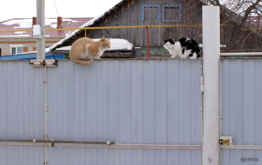 Мои три дворовые собаки: Герда, Бобик и Жужа в терпимо добрососедских отношениях находятся с моими котейками. С Бобиком так панибратствуют обоюдно. Но стоит забежать чужим кошакам, так все трое несут службу, аж из кожи лезут, по изгнанию чужаков с нашей территории. Dum spiro spero
