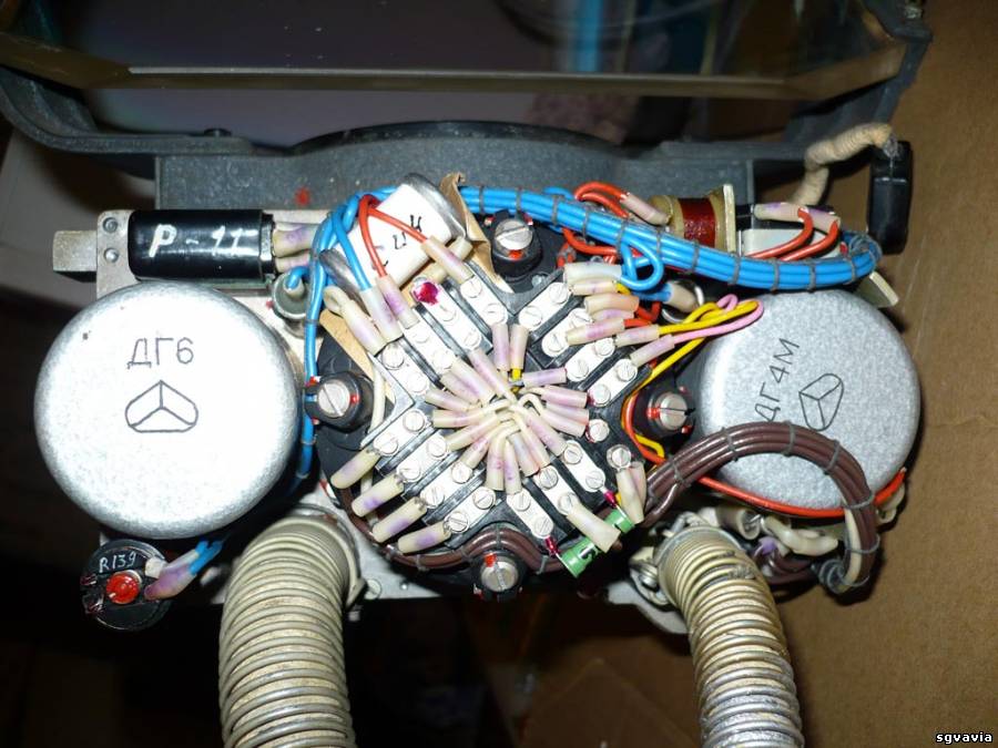 Двигатель в этом узле для раскрутки зеркала подвижной марки . (ДГ- вероятно двигатель генератор ). У меня стоит один по крайней мере . Запитка 36 В 400 Гц 2 фазы . Включал - раскручивается зеркало . Если напрячься и взять прицел в руки - помотать ним , то в режиме "гиро" и вращающемся зеркале подвижная марка начинает уходить в направлении противоположному вектору возмущения и потом подтягивается к центру . Короче как в жизни . А на хрена узел с кучей проводов : есть два подозрения - либо съём данных о положении зеркала (т.е. подвижной марки) и передача доп.потребителям (как я и писал раньше- радиоприцелы и т.д.) либо дополнительное управление зеркалом (коррекция подвижной марки) от какого-нибуть баллистического вычислителя (типа для разных типов вооружения - своя поправка вносится ). Короче АУУУ !!! Спецы по вооружению и прицельным системам - поправте нас и просветите !!!:) Ваши знания нужны нам !
