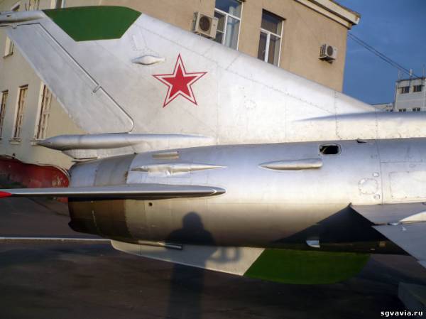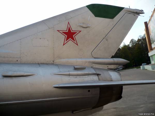 Вчера посетил славный город Луховицы. Там возле здания администрации устроено, что-то вроде небольшого открытого музея военной техники. Кроме танка, двух гаубиц, двух минометов имеется два самолета Л-29 и Миг-21. 21 довольно редкой модификации. Машина, для каких то испытаний. Давайте вместе попробуем определить, что это за МиГ. Самолет полностью перекрашен, створки шасси закрыты, так что обнаружить надписи о серийном номере, (кроме таблички в месте крепления цилиндра шасси) не удалось. Начнем с хвостовой части. Вверху имеется антенна видимо РСБН-2С. Но отсутствуют антенны СПО-10, хотя на плоскостях они есть (вернее то, что осталось). Вот, почему нет на киле антенн СПО-10, непонятно.
