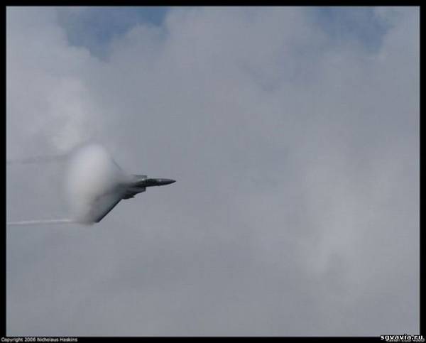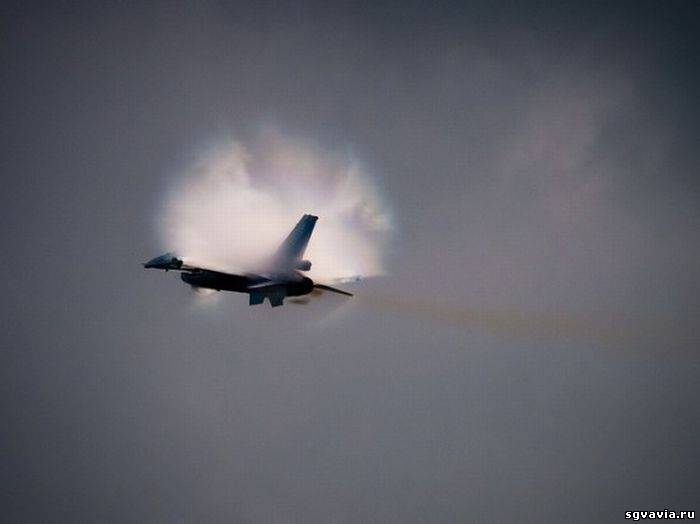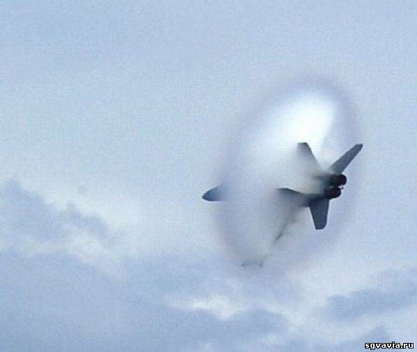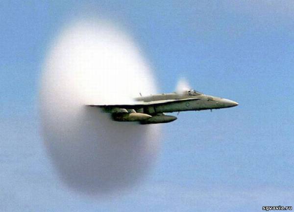 Замечательные фотографии с самолетами, которые преодолевают звуковой барьер, хотя много было статей об опровержении звуковых барьеров. Для шипко умных: Эффект Прандтля — Глоерта — явление, заключающееся в возникновении облака позади объекта, летящего на околозвуковой скорости в условиях повышенной влажности воздуха. Чаще всего наблюдается у самолётов. При очень высокой влажности этот эффект возникает также при полётах на меньших скоростях. Причина его возникновения заключается в том, что летящий на высокой скорости самолёт создает область повышенного давления воздуха впереди себя и область пониженного давления позади. После пролёта самолёта область пониженного давления начинает заполняться окружающим воздухом. При этом в силу достаточно высокой инерции воздушных масс сначала вся область низкого давления заполняется воздухом из близлежащих областей, прилегающих к области низкого давления. Этот процесс локально является адиабатическим процессом, где занимаемый воздухом объём увеличивается, а его температура понижается. Если влажность воздуха достаточно велика, то температура может понизиться до такого значения, что окажется ниже точки росы. Тогда содержащийся в воздухе водяной пар конденсируется в виде мельчайших капелек, которые образуют небольшое облако.