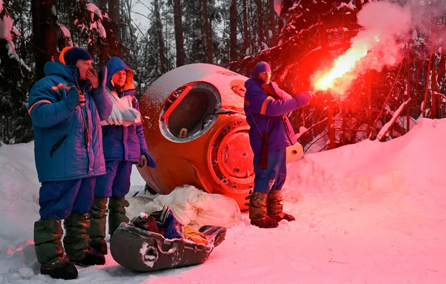 | Космонавты прошли тренировку по действиям в случае аварийной посадки в зимнем лесу