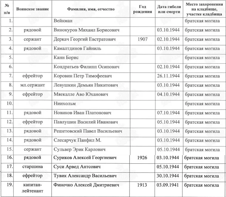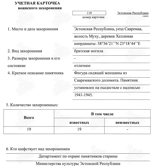 | Авиации СГВ МЕМОРИАЛЫ И ЗАХОРОНЕНИЯ СОВЕТСКИХ ВОИНОВ ВОИНСКИЕ ЗАХОРОНЕНИЯ В ЭСТОНИИ Сааремаа уезд, Эстония Захоронения на о.Муху (эст.Muhu) (Уезд СААРЕМАА (Saaremaa)) |