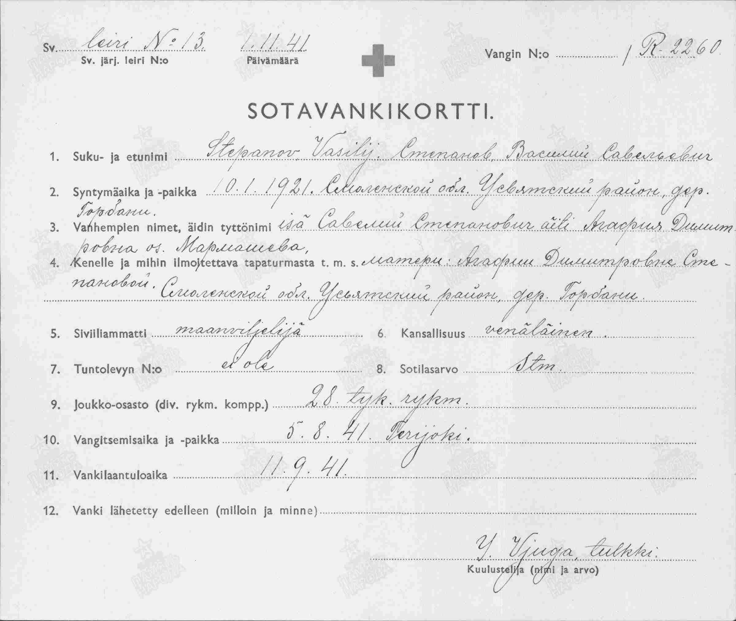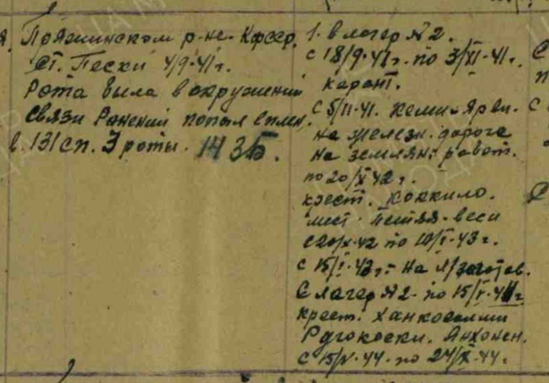 В числе работ бывший пленный упоминает земляные работы на железной дороге в районе Кемиярви. Это город за Полярным кругом, от Кемиярви железная дорога идëт на восток к Куолаярви и Алакуртти. Далеко от места пленения и регистрации... Это просто к слову.