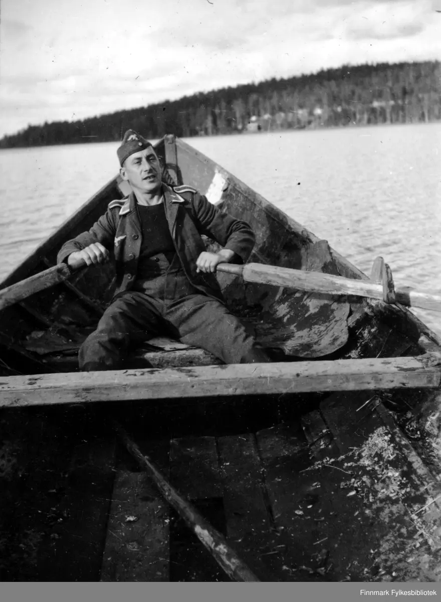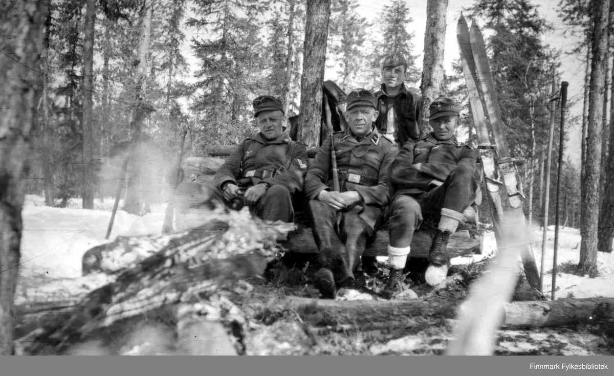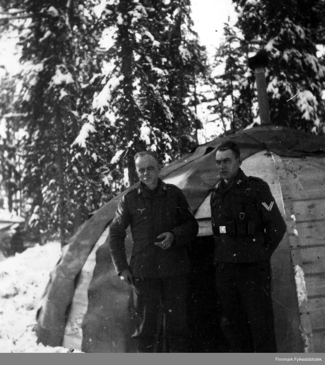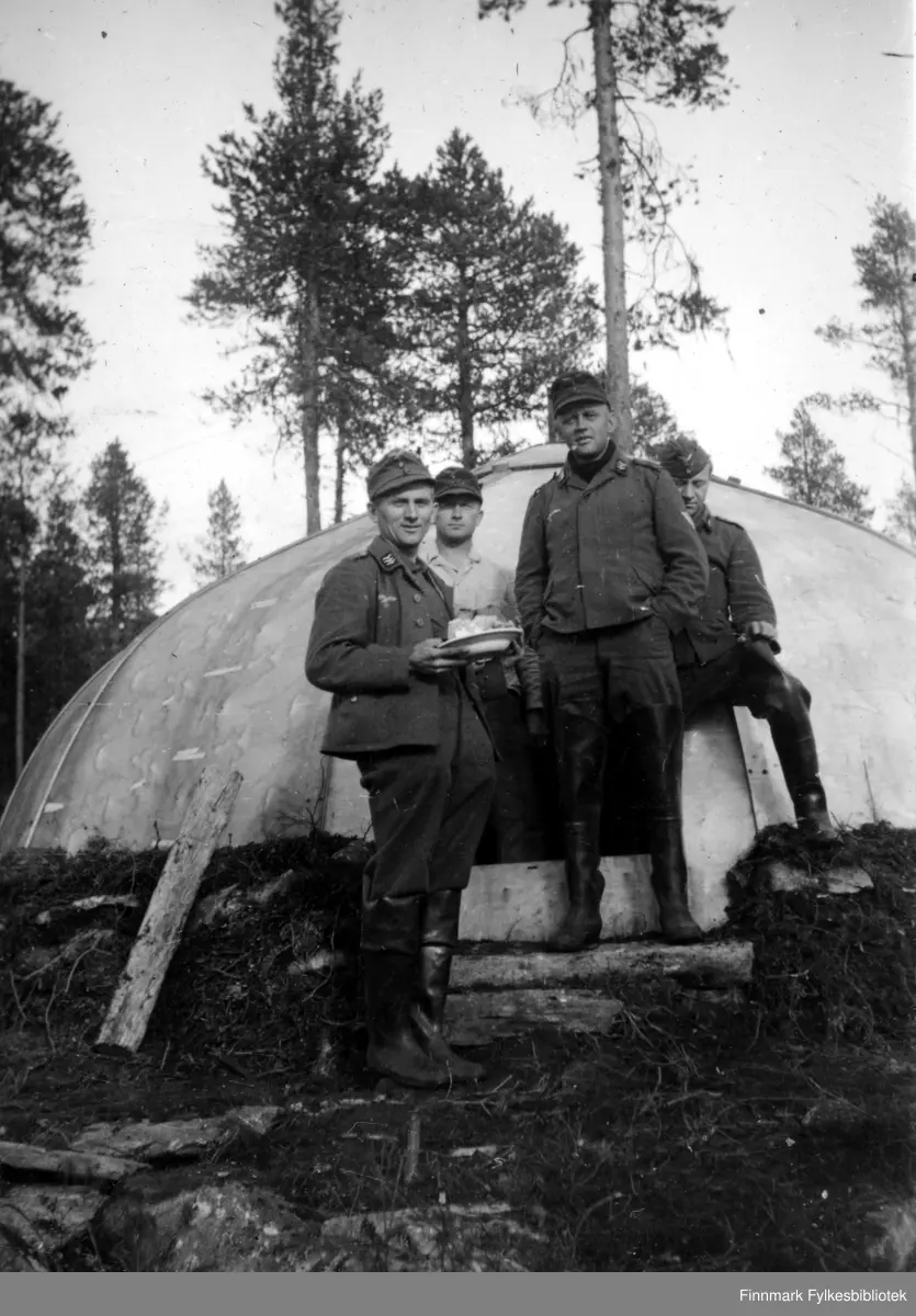 Четверо немецких военнослужащих позируют перед фанерным домиком типа «шведской хижины» в лагере военнопленных Вааттункивара (Шталаг 309) к северу от Рованиеми. Подпись к фото: «Lagerleben in Vadinkivara».