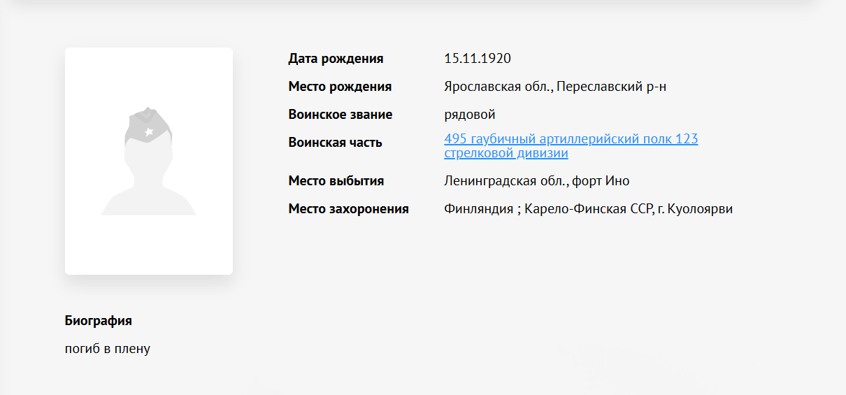 пример Жиганов Михаил Тимофеевич Дата рождения: 25.05.1913 Место рождения: Орджоникидзевский край, Благодарненский р-н, с. Алексеевка Воинское звание: рядовой Последнее место службы: 495 гап Воинская часть: 495 гап Причина выбытия: Попал в плен Место пленения: Ленинградская обл., форт Ино Лагерь: Лагерь № 6, Выборг Лагерный номер: Vi-1806 Дата пленения: 05.09.1941 https://pamyat-naroda.ru/heroes....%D0%BF&