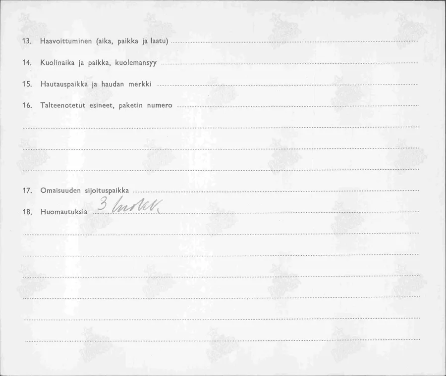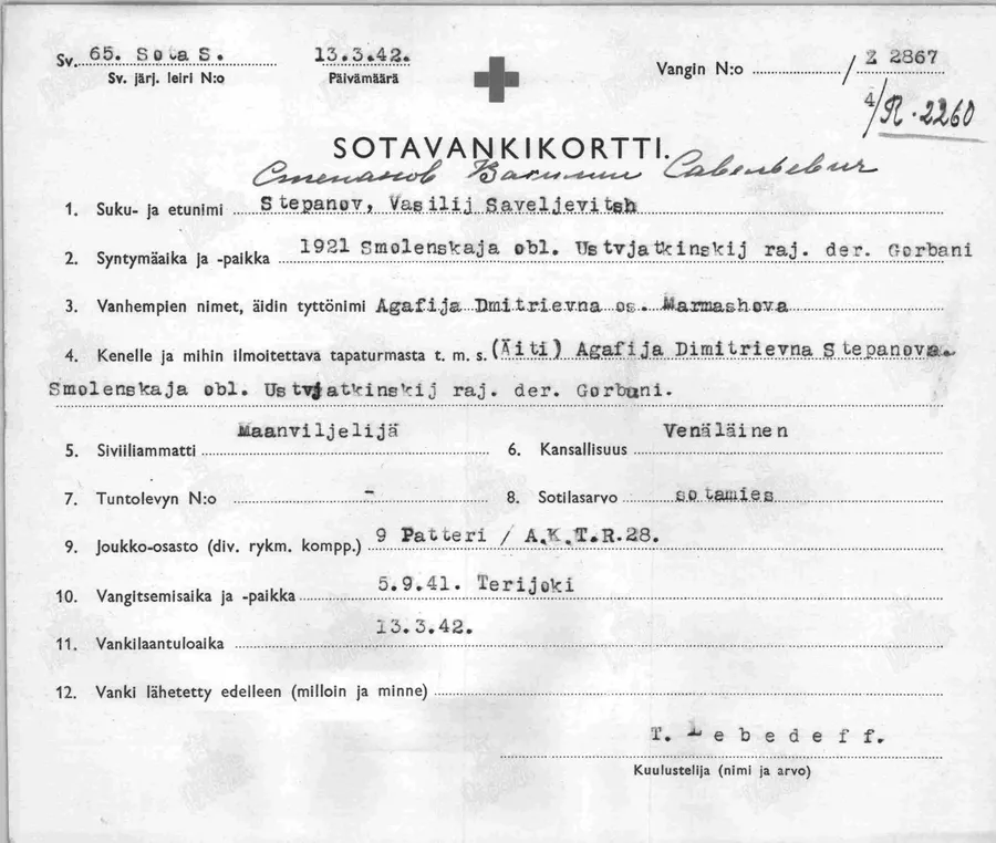 Карту Гаврилова я на данный момент понимаю так. Гаврилов, как и многие пленные, сразу не был зарегистрирован (вероятно), а мог находиться при финских воинских частях для черновых работ, такое практиковалось. Ну или первая карта регистрации не сохранилась. В карте Гаврилова мы видим, что пленён он 5.09.1941. Это дата пленения. В пункте 11 записывали дату помещения в лагерь (обычно это лагерь/госпиталь регистрации и заполнения карты), указанный в верхнем левом углу; для Гаврилова это 13.03.1942 Военный госпиталь 65. На тот момент этот госпиталь находился в Лаппеенранте, а не в Раудаскюле (оператор ОБД ошибся, это обычное дело). В этом (?) госпитале 27.03.1942 записано, что беспокоит больного: Jalat kipeat ja heikko "ноги болят и слабые".