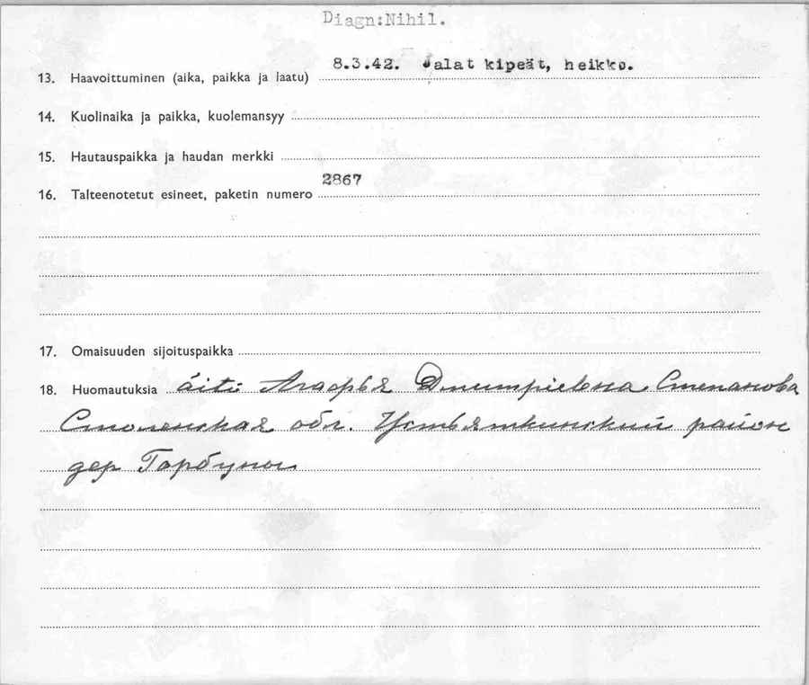 При этом жалобы на слабость у Смирнова датированы 8.03.1942: Jalat kipeat, heikko Ноги болят, слабые (слабый)