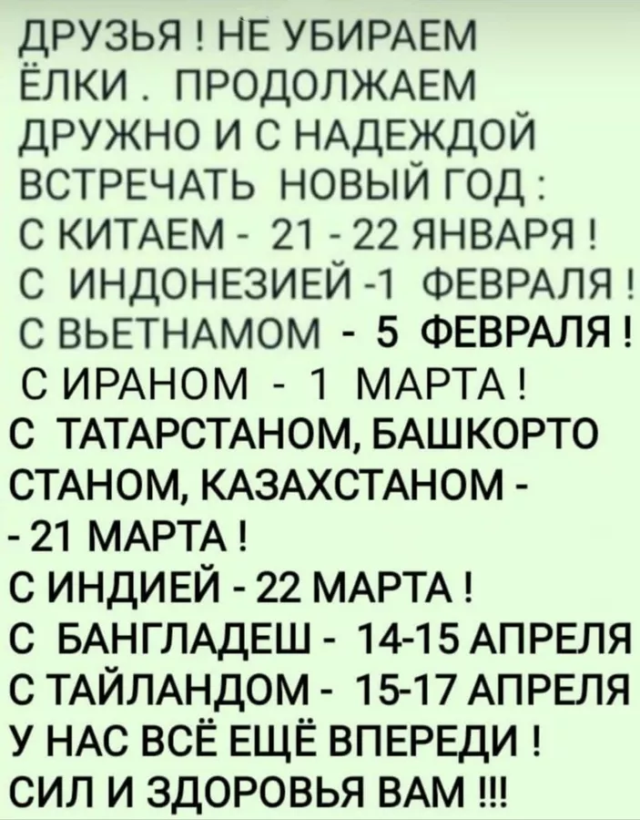 Добрый Вечер Форумчане Александр Иванович !!!! а где Старый Новый Год Ещё салаты не все доели и Самогон ещё киснет, шутю Хорошей рабочей недели завтра продержатся главное не проспать Всем здоровья Новых трудовых Побед Жизнь продолжается по ходу снова Маски введут и Карантин берегите не болейте в 2025 году даже насморка чтобы не было.!!! Ралиф Яхин