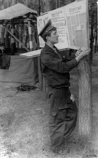 Секретарь бюро ВЛКСМ 1 аэ гв. ст. л-т Титаренко В. развешивает наглядную агитацию, аэродром Всхова.